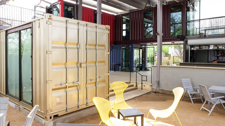 Container Bar is Austin’s first establishment comprised of multiple shipping containers that stack and angle to create a courtyard. Each box boasts different décor, and the bar will sport a movie screen and stage. Bridget Dunlap, owner. Architect: North Arrow Studio. Engineering: Big Red Dog.