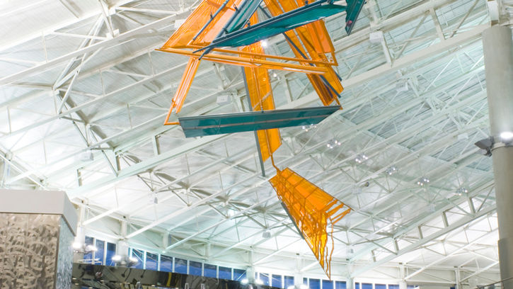 Fabricated for Luca Buvoli, commissioned by the Hobby Airport, Houston, TX. We thermo-formed cast acrylic sheets, secured them to metal frames and suspended them above the atrium. Despite the 70-foot scale, they appear weightless and as they fly through the air.